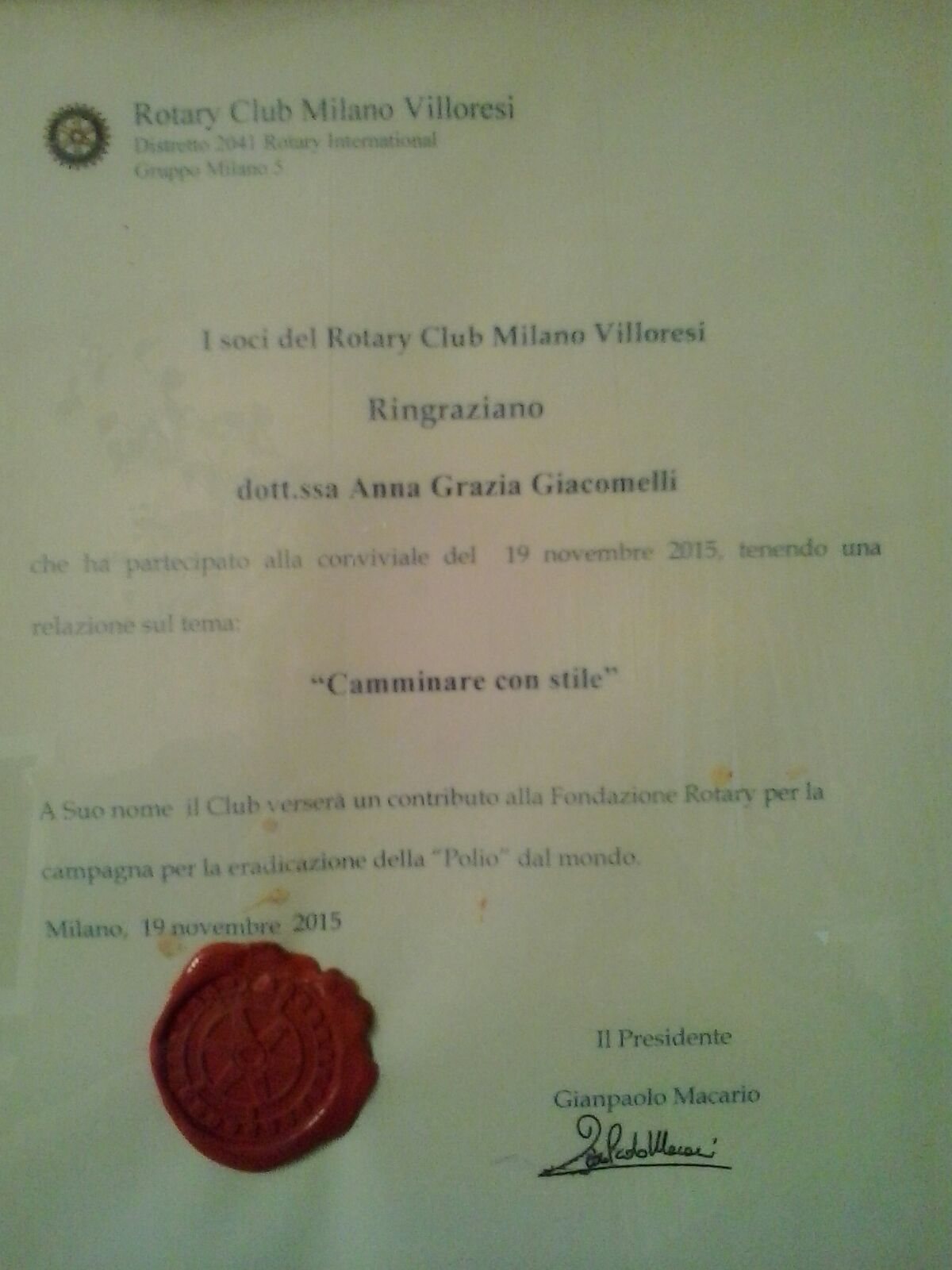 Anna Grazia Giacomelli e` stata gratificata dal Rotary Club Milano Villoresi per la sua relazione appassionata e competente, sia con apprezzamenti sia con concrete testimonianze.